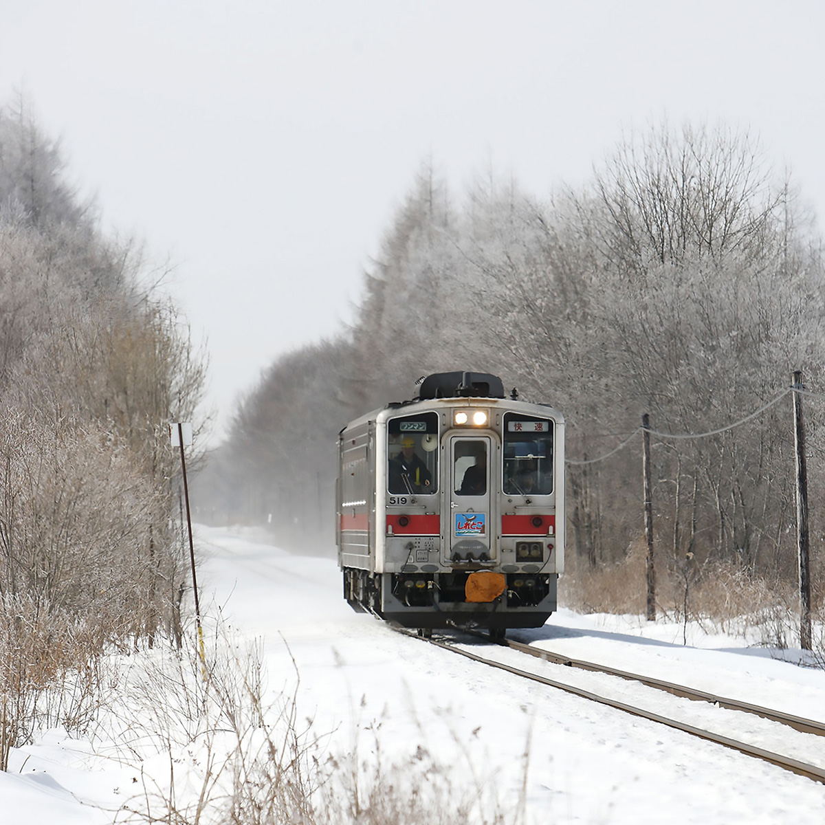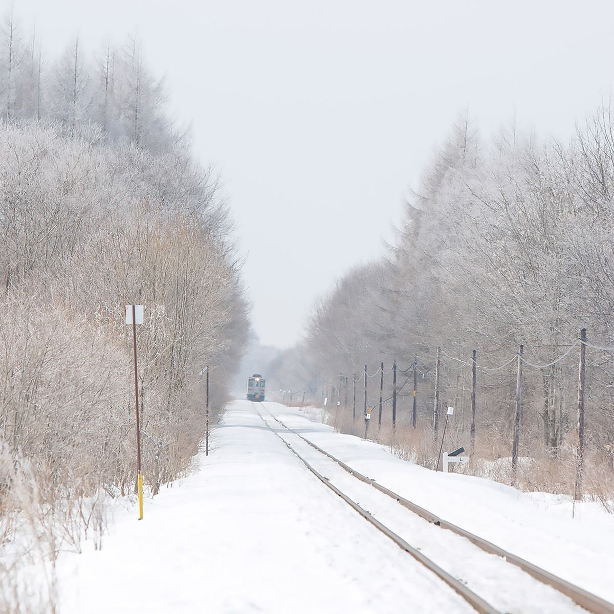 撮影地:北海道標茶町 雪原の中近づいてきた一両の列車。