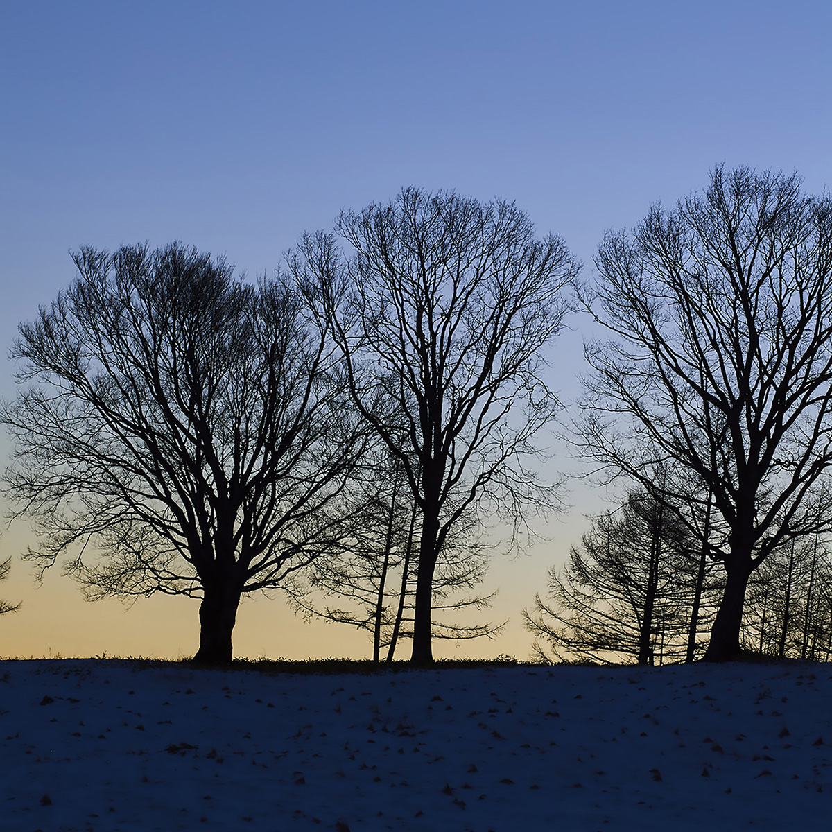 撮影地:長野県宮田村 日が沈み木々のシルエットが浮かび上がる。